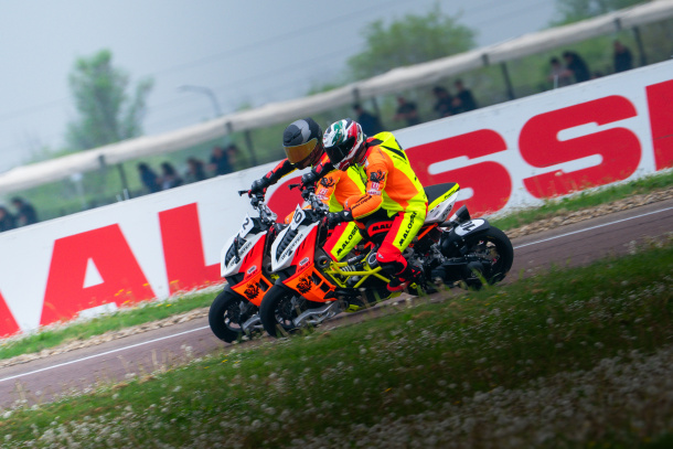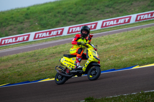Trofeo Nazionale Scooter Velocità al via con una griglia da urlo. La pole è di Ignacio Roman (Team D.P.S.) che in 1:15.068 si prende la prima casella mentre al suo fianco ci sono Andrea Guzzon (Guzz Garage) e Vincenzo Sciacca (Rotondo Corse) a guidare una prima fila che sta tutta in meno di 3 decimi. Poi il semaforo si spegne e non ce n’è per nessuno: al termine del primo giro (quello che vedrà uno dei grandi protagonisti, assoluti, Francesco Buscema – Buscema Racing Team – scivolare e ripartire, riuscendo poi a passare sotto bandiera in settima posizione) c’è Sciacca davanti di 82 millesimi a Guzzon. Ma la gara è ancora tutta da fare. Nei nove giri successivi, infatti, si alternano alla guida del gruppo di testa Sciacca, Roman, Francesco Reale (RF Competition) e Guzzon. Con passaggi sul traguardo al millimetro (tra i 10 e 86 millesimi di secondo. Millesimi…) per un quartetto di testa – con Reale sostituito poi da Sergio Boccardo (Rotondo Corse) - che gira in poco più di un decimo e mezzo e dà il meglio sotto bandiera: Guzzon passa davanti a Sciacca di 22 e a Roman di 59. Millesimi. Di secondo. Mentre nella seconda frazione il ritorno di Buscema, lì davanti, accende una sfida a sei con Reale (che però, purtroppo, pagherà con 6 secondi una partenza anticipata) e Boccardo a completare un gruppo compatto e una battaglia aperta, con continui cambi di posizione, Guzz davanti per molti giri fino alla zampata finale di Buscema, primo sotto bandiera per poco più di un decimo. Ma sul podio, più in alto di tutti c’è proprio Guzzon, mentre Sciacca è secondo (ma ritira anche il premio del giro veloce, firmato in 1:14.489) e Buscema terzo. Nel TNSV Replica il primo storico titolo di giornata è di Luca Bernardelli (Martelli Motors) in virtù di due primi posti di categoria (sesto e settimo assoluti) mai in discussione, dal primo all’ultimo giro, mentre alle sue spalle si contendono il secondo posto Fabio Quattroventi (Team D.P.S.) che con due secondi piazzamenti riesce ad avere la meglio su Matteo Guarnotta (Game Over) terzo sotto bandiera e sul podio.